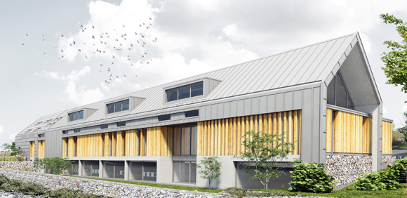 na potrzeby sal edukacyjnych i sal spotkań. Dach pokryty blachą tytanowo-cynkową. Elewacje drewniane